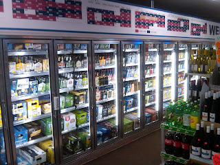 The selection of craft brew is pretty good. The picture to the left captures most of the doors that are filled with craft brew before changing over to the macro section. Pretty standard selection of craft brew--most regionals represented. No single bottles that I noticed.